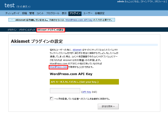 Akismetを有効にするためには APIkeyを設定する必要あり以下の手順を行う必要があります。