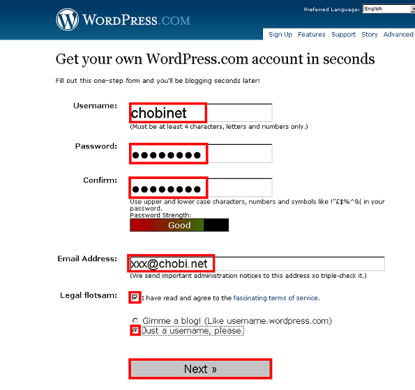 3.以下のページが表示されたら、赤枠の「sign up for a WordPress.com account」をクリックしてください。