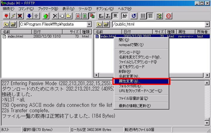 まずはindex.htmlの上で右クリックをして属性変更を選択。