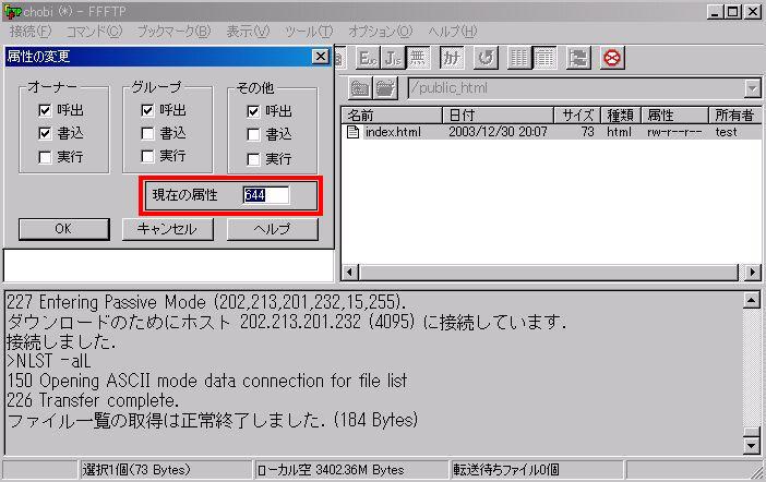 現在の属性を確認するとパーミッションは、644となっているようです。